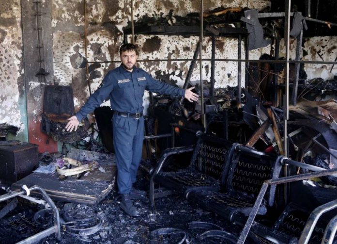 An Afghan man removes fragments of glass from a building after a suicide attack in Kabul, Afghanistan July 24, 2017.