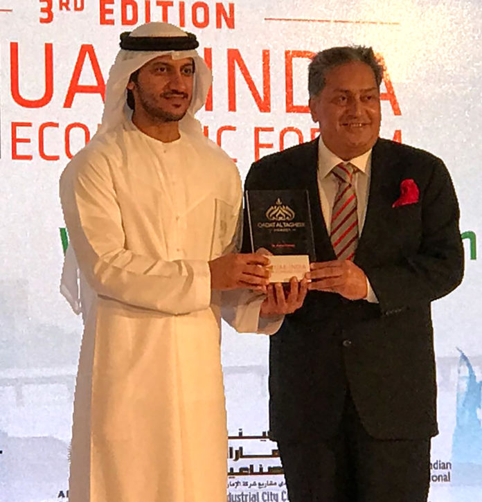 Dubai – Kamal Vachani, Hon Regional Director of Electronics and Computer Software Export Promotion Council (ESC) has been awarded Qadat Al Tagheer Award for Excellence in India-UAE Trade Promotion, at a glittering ceremony held on November 8, 2017 at Habtoor Grand Resort and Spa, Dubai. The award was presented by Juma Mohammed Al Kait, Assistant Undersecretary for Foreign Trade Affairs, Ministry of Economy, UAE.