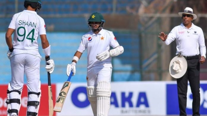 Skipper Azhar Ali was unbeaten on 57 — his first fifty in 14 innings — and Babar Azam on 22 not out.