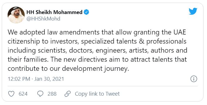 ‘We adopted law amendments that allow granting the UAE citizenship to investors, specialized talents & professionals including scientists, doctors, engineers, artists, authors and their families. The new directives aim to attract talents that contribute to our development journey.’
