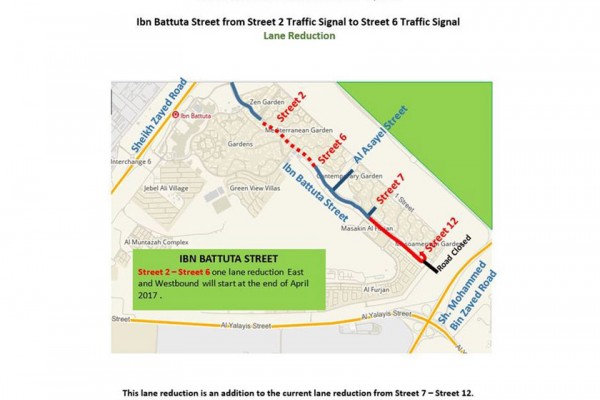 Eng. Maitha bin Adai, CEO of RTA’s Traffic & Roads Agency, said, “One lane of Ibn Battuta Street would be closed in the sector between Intersection 2 and Intersection 6. The diversion would remain in place until the completion of the required works.”